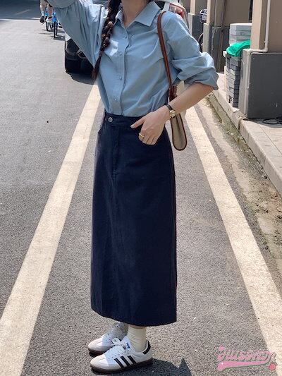 スカート デニム生地 ミディアム丈 スリット バックオープン ハイウエスト 脚長効果 美脚効果 細見え 春 白 水色 紺色 かわいい おしゃれ カジュアル 韓国ファッション レディース お出かけ | coolcoool