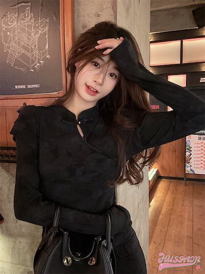 2024春夏 長袖Tシャツ女性春レトロデザイン ディスクバックルセンススリムボトムシャツシックショートトップス