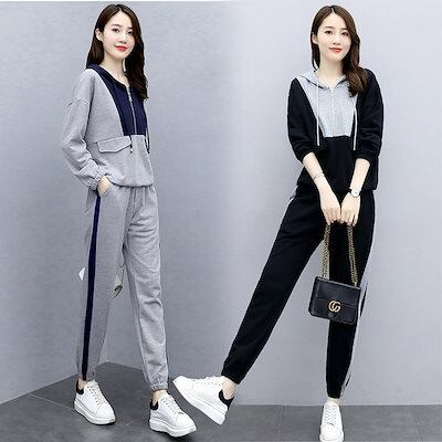初秋のスポーツフード付きセーター レディースファッション 春と秋のスプライシング薄手のカジュアルパンツ2点セット