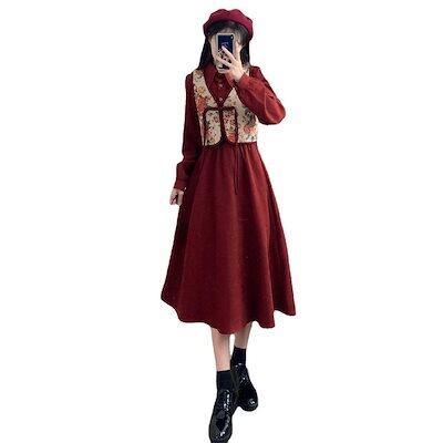 女性のためのヴィンテージコーデュロイカラー長袖ドレス 秋の中国プレートボタンウエストコートツーピースセットミディアム丈スカート