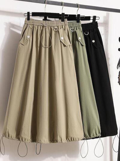 プリーツスカート アメリカンレトロ巾着ワークスカート 2024新作ゴムハイウエストラインスカート ゆったりカジュアルなミディアム丈の半そでスカート女性