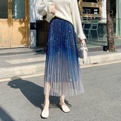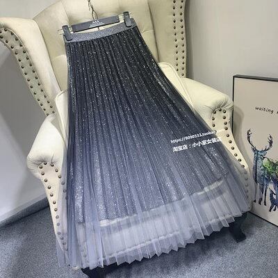 プリーツスカート 2024 秋冬グラデーションカラースターグリッターシルクピースゴールドダストメッシュヤーンビッグスイング半身スカート Aライン