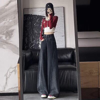 ブラック ストレート デニムパンツ レディース 秋冬 ハイウエスト 着痩せ ワイドパンツ モップ ロングズボン/ジーンズ