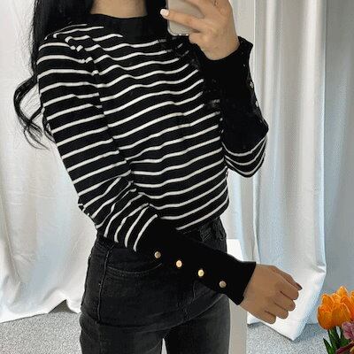 ソフト スリム 袖 襟章 ボタン ポイント ストライプ ストライプ ニット Tシャツ 2color
