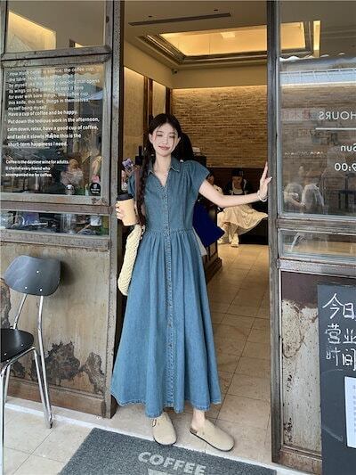 2024夏 韓国ワンピース デニム シャツ ロング丈 半袖 ボタン Aライン 細見え 夏 青 ブルー おしゃれ かわいい キュート 甘め きれいめ 韓国ファッション レディース お出かけ