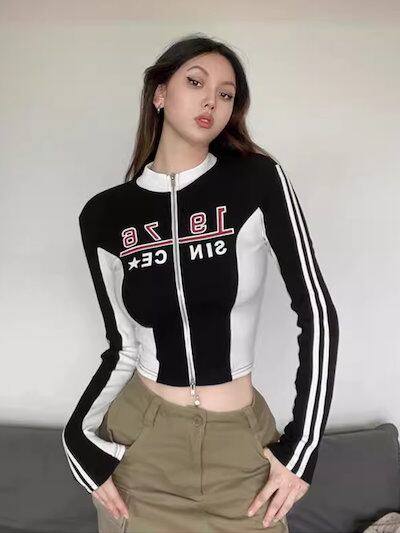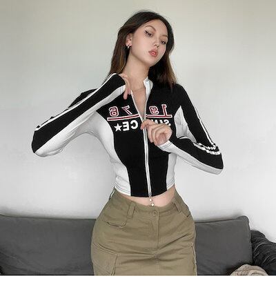 2024秋 長袖 Tシャツ ショート丈 カットソーワッペンK-POPトップス カジュアル 配色韓国系ストリートへそ出しタイトネックスリーブダブル肌見せ T ファッションレディースかわいいサイド衣装風冬 | coolcoool