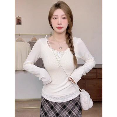 2024秋新作 ロングTシャツ 小花柄ローカラーボトムブラウスインナー秋冬 韓国 スウェット トップス ティーシャツ ロンT 長袖 tシャツ