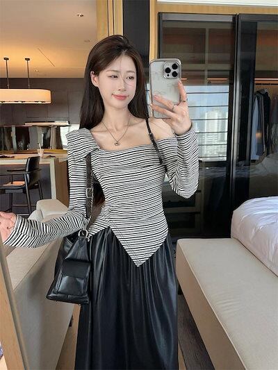2024秋冬トップス シャツ 長袖 ボーダー アシンメトリー 肩見せ 大人っぽい ガーリー 甘め キュート 秋 黒 茶色 おしゃれ かわいい 韓国ファッション レディース お出かけ | coolcoool