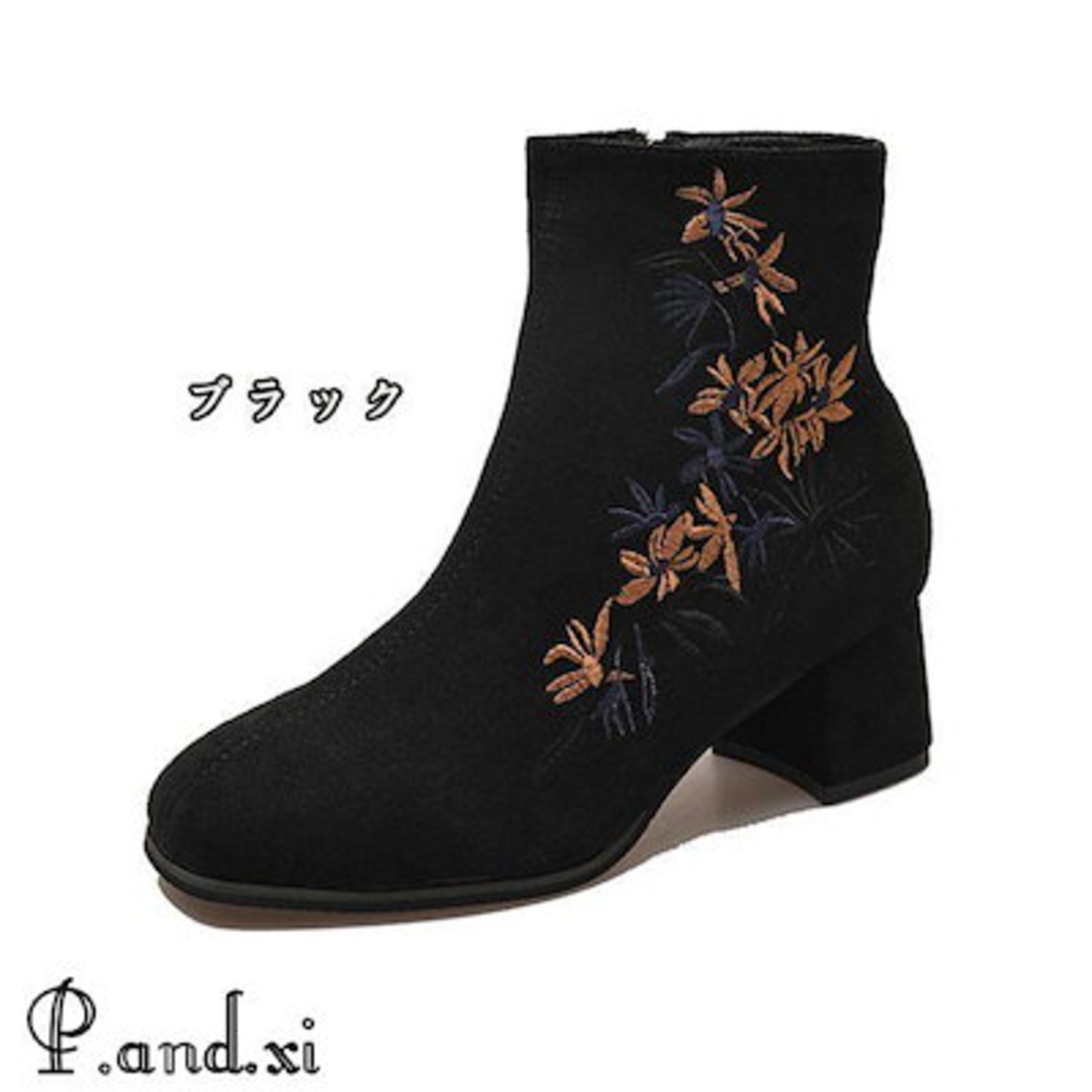 シンプル ブーツ シューズ スエード スムース 太ヒール レディース サイドジッパー ショートブーツ サイドファスナーブーツ 刺繍ブーツ 秋冬 センチヒール
