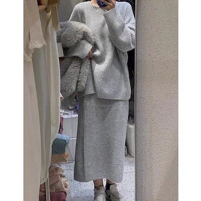 【2枚購入で 2oo円OFF!】秋冬 新作 シンプル 気質 レディースセットアップ 丸ネック 百掛け アウター 二点セット 上下セット セーター ニットスカート セットアップ