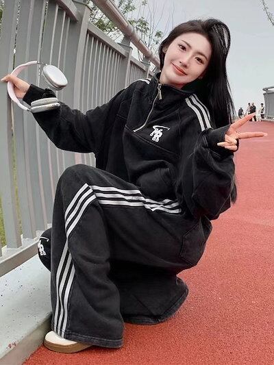 2024 秋冬 2点セット トップス 羽織り ショート丈 セットアップフルパーカートレーナーラウンドヘムルーズ サイド上下ボトムスストレート系冬ゆったりサイズワイドシルエットハーフリラックストラック | coolcoool