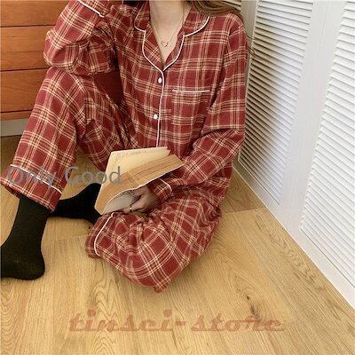 パジャマ レディース ルームウェア 冬 セットアップ 長袖 上下セット 前開き 可愛い ロングパンツ 厚手 韓国風 寝巻き 部屋着 チェック柄