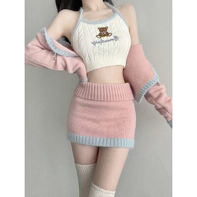 2024 insファッション セーターカーディガン+ギャルベアーキャミソール+ヒップスカート ジャージ パーカー セットアップ レディース スウェット上下セット 3点セット