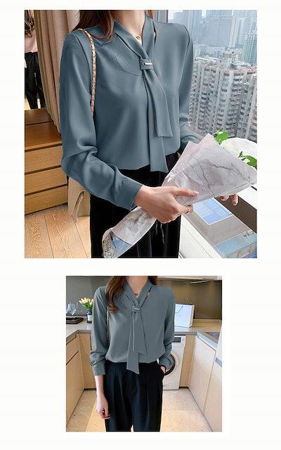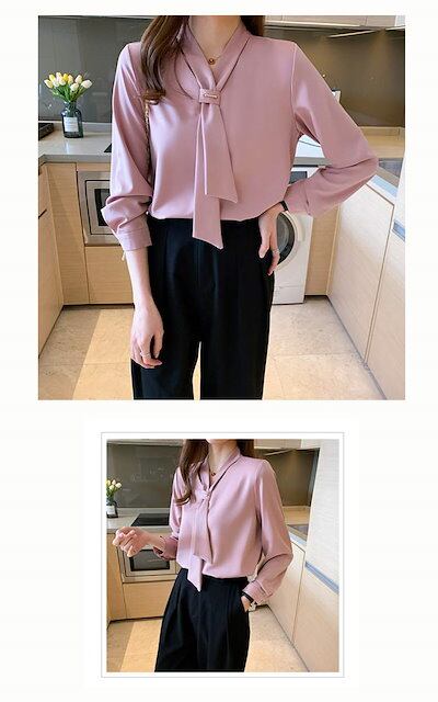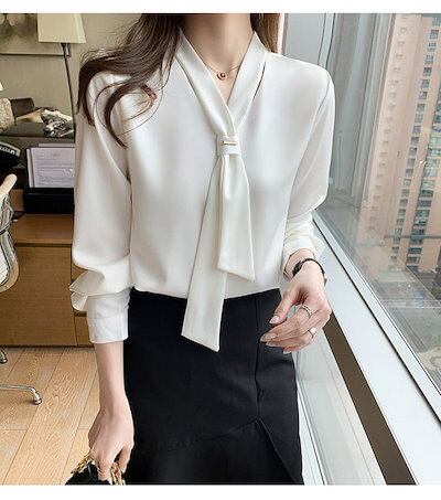 ボウタイ ブラウス 長袖 シフォン トップス レディース リボン シフォンブラウス Vネック 長袖ブラウス ゆったり 無地 シャツブラウス フォーマル オフィス スーツ インナー おしゃれ 上品 大人 | coolcoool
