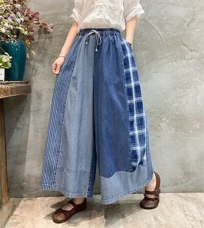ワイドパンツ デニム レディース 切り替え ジーンズ ガウチョパンツ デニムパンツ ジーパン 体型カバー 大きいサイズ