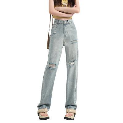 ダメージジーンズ レディース ハイウェスト ワイドパンツ 春夏 着痩せ スト レート モップパンツ