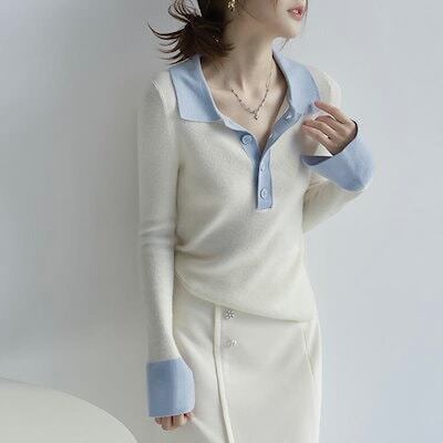配色 ニット フレアスリーブ レディース トップス 長袖 セーター 襟付き 折襟 カットソー tシャツ ボタン付き フィット オフィスカジュアル 長袖ニット ニットトップス きれいめ 上品 大人 ニッ | coolcoool