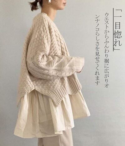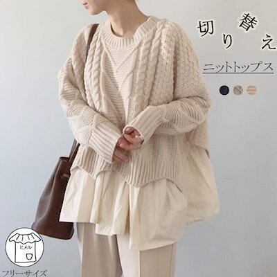 切り替え ニット セーター レディース 長袖 秋冬 ニットセーター レイヤード風 丸首 ケーブル編み 長袖ニット 重ね着 ふんわり ハンカチヘム クルーネックニット 異素材 切替 ドロップショルダー | coolcoool