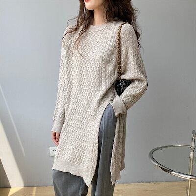 セーター レディース 秋冬 ニットセーター ケーブル編み 長袖 サイドスリット ニット プルオーバー クルーネック 丸首 カットソー 無地 フェミニン シンプル 体型カバー 大きいサイズ ファッション | coolcoool