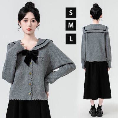 トップス 襟付き ニット ニットセーター セーター セーラーカラー レディース 長袖 襟 ショート丈 ニットトップス 可愛い リボン バイカラー 秋 冬 あったか きれいめ グレー かわいい おしゃれ | coolcoool