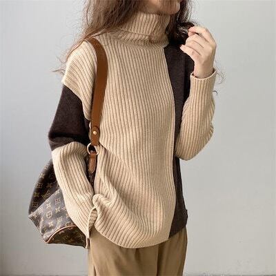 ニット セーター レディース 秋冬 長袖 セーター レディー ス 秋 冬 ニットセーター プルオーバー タートルネック 配色 切り替え アシンメトリー エレガント シンプル 無地 体型カバー 大きいサ | coolcoool