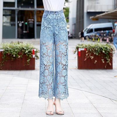 ひんやりボトムスデニムボトムス 秋 デニムパンツ ハイウエスト ワイドパンツ レディース 夏 デニム ズボン 透かし彫りレース 設計 ジーンズ ゆったり ストレート デニム パンツ | coolcoool
