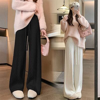 ケーブルニット シンプル パンツ ガチョウ ニットパンツ 秋冬 カジュアル 暖かい レディース ワイド ワイドパンツ ボトムス フレア ロング ウエストゴム ピンク ガチョウパンツ ニット きれいめ | coolcoool