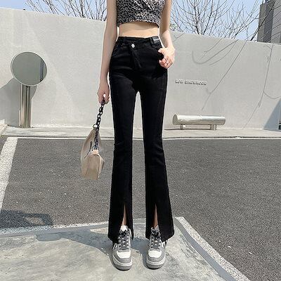 デニムパンツ ズボン ジーンズ ハイウエストデニム スリット入りパンツ スキニーパンツ ワイドパンツ レディース パンツ ロングパンツ