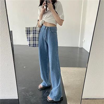 ひんやりボトムス 脚長効果!スキニーパンツ デニムボトムス スキニーパンツ ワイドパンツ 韓国ファッション デニムパンツ リブ ズボン ゆったり 着やせ 百掛け ハイウエスト ボトムス レディース ハ | coolcoool