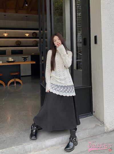 トップス Tシャツ レース 透かし彫り ハイネック 丈長め 長袖 スリム 細見え 秋冬 白 韓国ファッション レディース おしゃれ かわいい 甘め ガーリー キュート カジュアル お出かけ | coolcoool