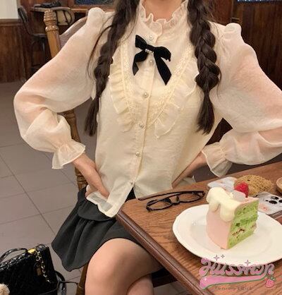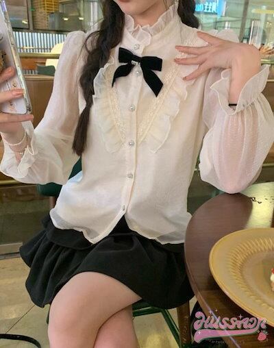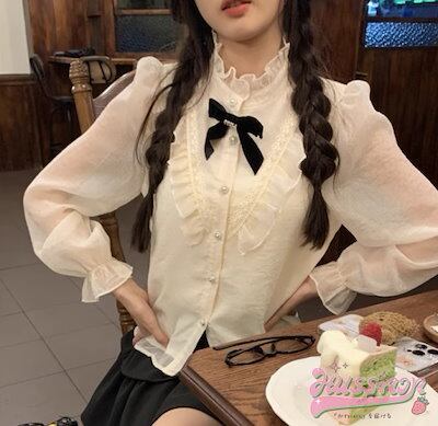 トップス シャツ ブラウス 長袖 ポエットスリーブ Vネック 襟 ピューリタンカラー 花柄 フリル 白 かわいい おしゃれ 夏 韓国ファッション レディース お出かけ