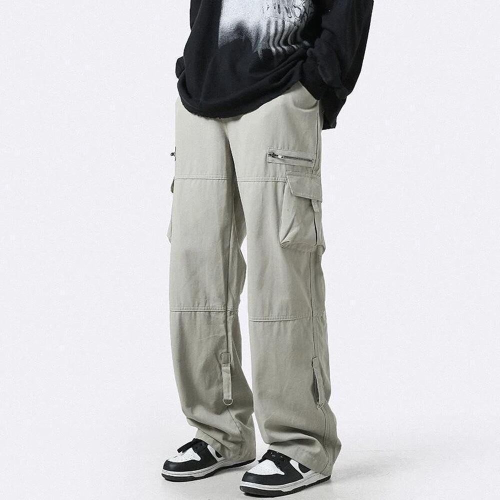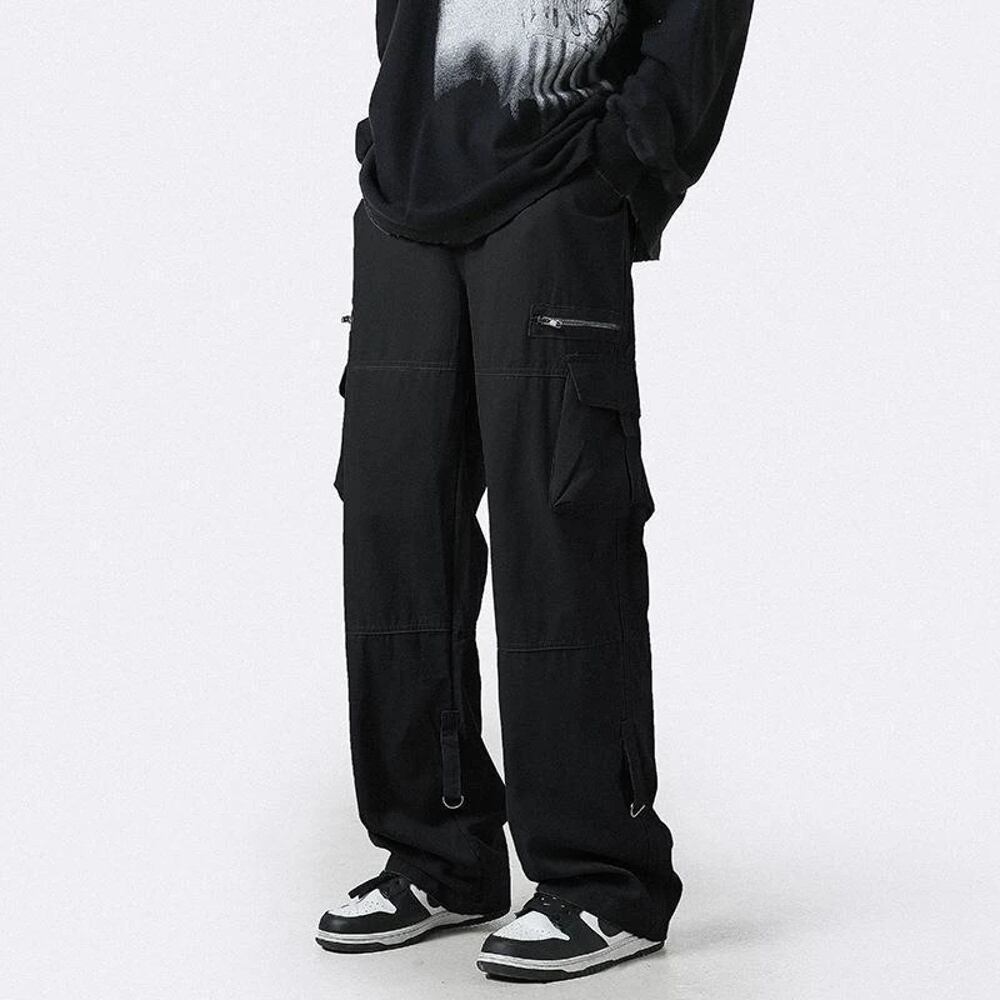 Houzhou-ジッパー付きメンズカーゴパンツ、ワイドレッグパンツ、特大ジッパー、メンズストリートウェア、ヒップホップ、カジュアル、韓国、日本、ポケット、安全スタイル y2k ボトムス T240902102119_01 | coolcoool