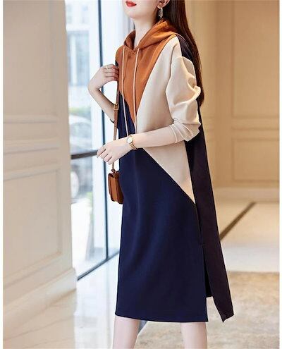 パーカーワンピース レディース 春 秋 長袖 きれいめ フード付き ワンピース バイカラー スウェット 膝丈 切り替え マルチカラー カジュアル ゆったり ロング丈 切り替えワンピース 体型カバー 春