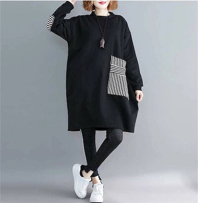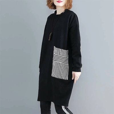 チュニックワンピース レディース 秋冬 裏起毛 チュニック ワンピース 長袖 ドッキング スウェット トップス パーカー ポケット付き 切り替え パーカーワンピース ストライプ プルオーバー 無地 体 | coolcoool