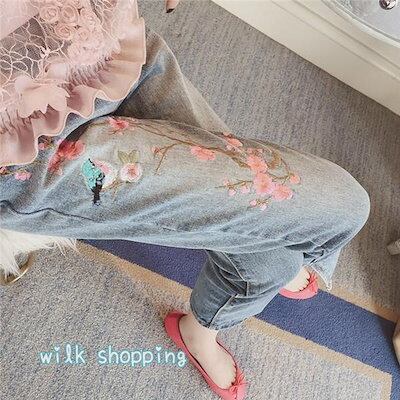 デニムパンツ レディース スキニー 刺繍 花柄 スリット ボトムス ジーンズ ストレッチ 伸びる 細身 アンクル丈 美脚 カジュアル スリム 薄手 秋