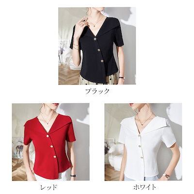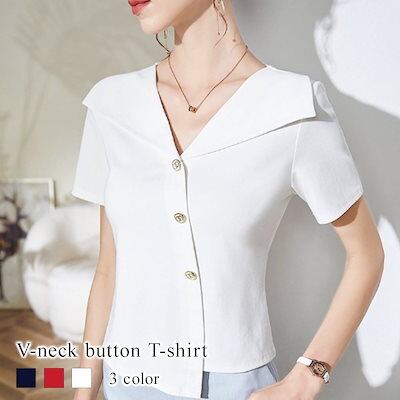 ブラウス レディース VネックボタンTシャツ 春 おしゃれ フォーマル カットソー カジュアル レース オフィス 半袖 白 シャツ リボン 事務服 Tシャツ 涼しい 大きいサイズ フリル 安い 人気 | coolcoool