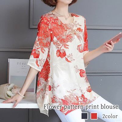 Tシャツ レディース 花柄プリントブラウス 大人 40代 ブランド かわいい 夏 ゆったり ロング スポーツ トレーナー Vネック ブラウス 人気 ジム 涼しい おしゃれ 7分袖 ティーシャツ 5分袖 | coolcoool