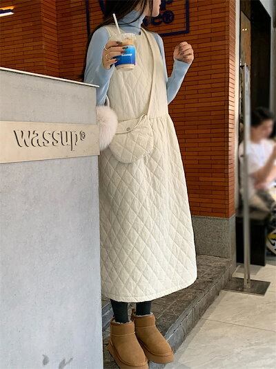 キルティングワンピース レディース キルティング 秋冬 ロングワンピース ロング ノースリーブ ロング丈 クルーネック 丸首 ハイウエスト バックリボン フレア ワンピ 袖なし シンプル きれいめ ゆ | coolcoool
