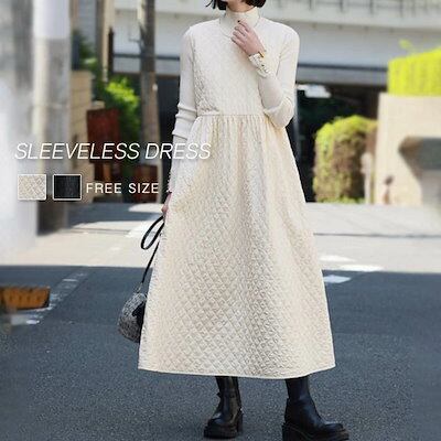 キルティングワンピース レディース キルティング 秋冬 ロングワンピース ロング ノースリーブ ロング丈 ミモレ丈 ハイウエスト バックリボン フレア ワンピ 袖なし シンプル きれいめ ゆったり 暖 | coolcoool
