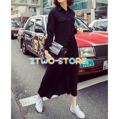 2色有り レディース シャツワンピース 長袖 ロング丈 シャツ襟 ドローストリング ハイウエスト ウエスト紐 無地 ポケット付き ゆったり 楽ちん カジュアル S-2X