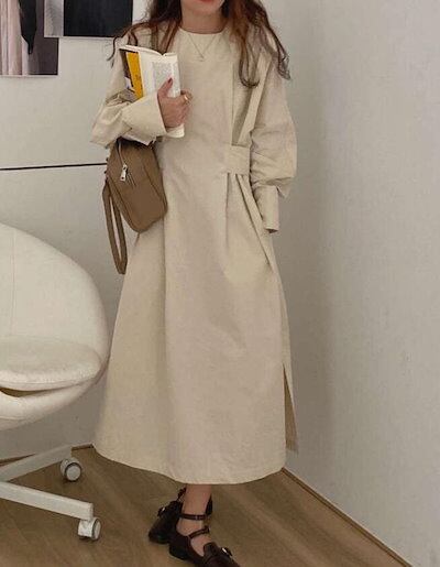 ロングワンピース ワンピース レディース ロングワンピ ロング丈 長袖 無地 春 夏 秋ポケット クルーネック ウエストタック Aライン フレア ハイウエスト 体型カバー フェミニン 大人 カジュアル | coolcoool