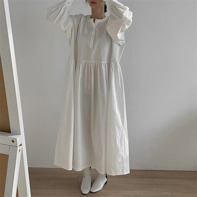 シャツワンピース バンドカラー ワンピース レディース 春 秋 長袖 ロングワンピース 春秋 ゆったり 体型カバー ワンピース ロング マキシワンピ 大人 ロングワンピ ハイウエスト ギャザー 大きい | coolcoool