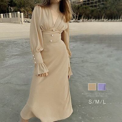 シフォン ワンピース レディース 春秋 冬 タック vネック ワンピース ロング 秋冬 長袖 フレアワンピース きれいめ ハイウエスト タックワンピー aライン 大人 ファッション 無地 シンプル カ | coolcoool