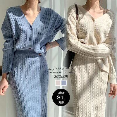 上下セット ツイストニットワンピース 秋冬 ロングニットワンピース Vネック ニットカーディガン レディース タイトワンピース セーター+ハイウエストスカート 優雅 パーティー プリーツ 通勤お出掛 | coolcoool