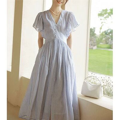 ワンピース シャツワンピース レディース 半袖 夏 ストライプ ロングワンピース シャツワンピ Vネック ハイウエスト 気質 フレアワンピース ナチュラル 大人 可愛い Aライン オフィス 通勤 着回 | coolcoool