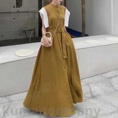 ワンピース ドレス 袖あり 配色 シャツワンピ レディース きれいめ カジュアル おしゃれ 半袖 大人 可愛い フェミニン マキシ丈 ロングワンピ バンドカラー 体型カバー ハイウエスト 韓 | coolcoool