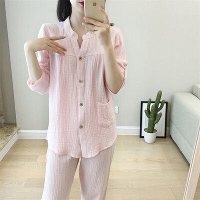 パジャマレディース綿ウェアガーゼ上下セット部屋着ナイトウェアかわいい前開き長袖長ズボンコットンシャツウェアセット肌に優しい哺乳敏感肌婦人用母母の入院ガーゼ無地