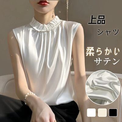 マウンテンパーカー シアーシャツ ブラウス カーディガンシフォンブラウス 【上品】サテンブラウス レディース 夏 無地 高級感 垂れ感Tシャツ ノースリーブトップス 韓国ファッション ??感 木耳縁襟 | coolcoool