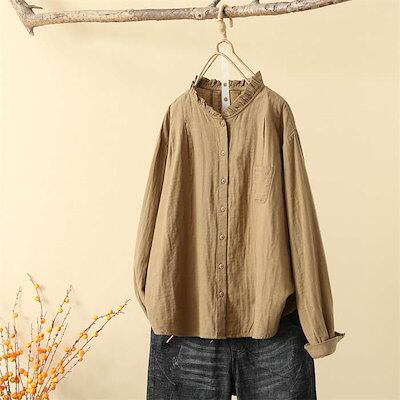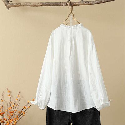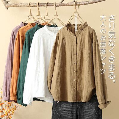 シャツ レディース 長袖 立ち襟 お洒落 ダブルガーゼ ブラウス 綿100% 前開き オフィス ブラウス 春 トップス 大人 カジュアル シンプル 体型カバー 大きいサイズ ゆったり ホワイト パーブ | coolcoool
