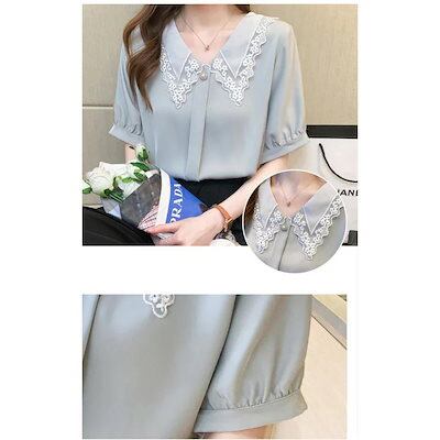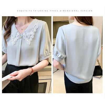 ブラウス レディース 40代 春夏秋新作 オシャレブラウス 白シフォンシャツ 半袖トップス レース折り襟ブラウス パフスリーブ 大人 通勤 ゆったりT シャツ